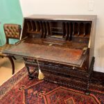 1930年代 ライティングビューロー KENTSTORE TOKYO ライティングビューローとは? ライティングビューローとは、引き出しなどの収納が付いた書台になります。 特徴としては、上部の扉を手前に倒すと簡易デスクになる便利な家具です。 原型は、当時人気があった中国や日本の櫃(観音開きの扉には蒔絵などが入った箱型)で 櫃の扉を開けると沢山の小引き出しがある作りでした。 この櫃を、英国で製作されたスタンド(台)に乗せて使用するのが一般的だったのですが 英国で模倣して製作されたものが「キャビネットオンスタンド」になり、 次にライティングスペースと収納があるチェストオブドロワーズの機能が付く事で 現在のライティングビューローとなり、家具として完成されてきました。 皆さん海外映画などで知る機会もあるので「いつかはビューローが欲しい!」という方は 年齢と男女を問わずにとても多い憧れのアイテムなのです! 人生で机を使う時期としては、やはり幼少から青年くらいまでの学生時代が多いと思いますが いつしか机は物を置く台になっていたりで、購入するのにとても悩むアイテムともいえます。 置き場所に困らないサイズ感、お部屋のインテリアとしても楽しめるデザインや収納力など なかなか万能なアイテムであるライティングビューローは、アンティーク家具の中でもおすすめです! 写真のライティングビューローは少し大きめですが、これでもかってくらいのアンティークらしさが あるので解説していきたいと思います。 ピジョンホールと呼ばれる細かく仕切られたデスク内部 まずご紹介するのは、「ピジョンホール」と呼ばれる書簡を収納する為の仕切り棚です。 良質のビューローや、年代が古めのビューローではピジョンホールの作りがとても凝っています! 直線でなく、曲線を取り入れた仕切りのデザインや小引き出し付きに作り手のこだわりが感じられます。 また、手紙が散乱しないように中央の棚は少し斜めになっている事も細かい気使いです! インクボトルを入れる少し深めのスペースや、ペンが転がらないように彫られているところも特徴です。 最近では調味料や茶葉などを細かく収納したりして、キッチンスペースで使用する方も増えています。 ステイ金具とフラップヒンジ ここにもこだわりが! ヒンジと呼ばれる金具も蝶のようなデザインのタイプが使用されています。 通常は長方形が多いのですが、こんなところにも作り手のこだわりを感じます。 真鍮の無垢材で削り出せれているので良い風合いです! 右に見えるステイ金具ですが、こちらが「ルーパー」と呼ばれるデスク天板を押さえる角材を 自動的に出し入れする誘導の金具になります。 デスク天板を手前に倒すだけで、ルーパーも合わせて出てくる仕組みです。 収納だけでなく、こんなところも機能的なのがこちらのライティングビューローです! オリジナルの真鍮ハンドルとアプライドモールディング 続いてオリジナルの「真鍮製ドロップハンドル」です。 もちろん真鍮の無垢材で削り出されており、受け金具のプレートには植物の装飾が彫られています。 派手な装飾が入ったタイプは鋳物が多いのですが、やはり真鍮の古美色は使い込むほど味が出ます。 また、正面全体(デスク天板・引き出しの前面)に施された「アプライドモールディング」が圧巻です! ジャコビアン期に流行した面材装飾方法で、製材技術の進歩があっての装飾です。 モールディングと合わせて多くデザインされるのが草花の彫刻と「バーリーシュガーツイスト」になり 違うアイテムでも組み合わせとして多く見られるので、探してみると面白いかもしれません。 ツイストレッグとバンフィート 最後に「バーリーシュガーツイスト」の脚と、脚先のバンフッドになります。 捻じり飴菓子からデザインされたツイストレッグはストレッチャーにもツイストが使われています。 年代が新しくなると、見える前脚だけで後ろ脚はストレートの角材が使用される事が多いですが こちらのライティングビューローは後ろ脚も同様のツイストレッグが贅沢に使用されています。 18世紀初めに流行した「バンフィート」、脚先の丸平型のデザインを指しますが こちらはハンバーガーなどの丸型バンズが由来です。 写真で紹介していませんが、本体裏側の背板には3枚組でオークの無垢材が使われています。 デザインや内部、材料も含めてこだわりのある逸品を解説含めてご紹介させて頂きました。 重厚感のある素晴らしい逸品になりますので、お探しの方は是非ご検討ください。 KENTSTOREでは、ご紹介した以外にも猫脚が美しいビューローや 上部に本棚が付いたビューローブックケースなどもございます。 ご興味がございましたら、是非お問い合わせ下さい。 英国アンティーク家具のお買いものはこちら 英国ヴィンテージ家具のお買いものはこちら ブログのトップページはこちら ケントストアオンラインショップはこちら 静岡本店 TEL : 054-204-7003 ⬅ 