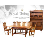 チャールズ皇太子・ダイアナ妃メモリアルウェディング限定モデル ロイヤルダイニングセット このダイニングセットは英国を代表する伝統的家具メーカーオールドチャーム(Old Charm)社製のものです。 1924年にハーバードウッドにより設立され、品質と実用性を重視した流行に左右されない家具づくりか特徴で、ハンドメイドの彫刻とエリザベス期のデザインが特徴的です。 かつての英国はオーク材の宝庫であり、その硬質で気密性が高く強度があるため細かな彫刻を施すのに適しています。 オールドチャーム社は現在の英国においても人気が高く、老舗ブランドとしてアンティーク市場でも年代ものは出回っています。 1981年7月29日セントポール大聖堂でチャールズ(Charles Prince of Wales)とダイアナ(Diana Frances Spencer)がご結婚致しました。 オールドチャーム社が結婚を記念して限定200台で製作したのが、このダイニングセットです。 「理想のカップル」、「ダイアナフィーバー」など大変な人気でした。 その後もダイアナ人気は高かったのですが1997年フランスパリで36歳という若さで不慮の事故で他界しました。 ダイアナ人気は現在の英国でも非常に高く、その人気と限定生産という希少性から、この家具はアンティーク市場でも価値が上がり続けています。 【解説】ロイヤルダイニングセット ドローリーフテーブル ドローリーフテーブルの歴史は16世紀後半から始まります。 チューダー朝エリザベス期に原形が出来、17世紀初頭ジャコビアン期に流行した引き出し(チェスト)の技術が応用されリーフ(ウィング)付きの伸張式テーブルが誕生しました。 天板が2重になっており左右のリーフを天板から引き出し伸張します。 3WAYでお使いいただけます。ドローリーフテーブルはオーク材がよく使用されます。 オークの木目は虎の模様に似ている事からシルバーグレイン(虎斑)と呼ばれています。 斑は「繁栄」を表しています。 脚のデザインや彫刻が年代の流行によって異なっているため当時の雰囲気を楽しめます。 ドローリーフテーブル詳細① こちらのドローリ-フテーブルを見ると一見シンプルなデザインですが、様々なところにオールドチャームのセンスが光る家具だと言えます。まずはやはり一番眼を惹くプリンス・オブ・ウェールズの紋章です。英国では日本のような家紋が存在します。チャールズの場合、両脇にあるイングランドを象徴するサポーターのライオンと中央にはプリンス・オブ・ウェールズの副紋章であるガチョウの羽が特徴的です。この紋章を職人の手作業により彫刻されている為、貴重性が伝わってきます。 ドローリーフテーブル詳細② そして紋章を引き立たせる為、脚のデザインはシンプルなデザインにしていると考えられます。 形はドローリーフテーブルの原型が出来た頃の1570年~1700年にデザインされたドーリックコラム(Doric column)とわかります。 これはドリス様式の円柱と言う意味です。 当時、バルバスレッグ重厚感があるデザインから繊細で手すりのような華奢なものに流行が移り変わっていきました。 当時食事後女性はすぐリビングへ移動し、男性達は残って酒を楽しんでいました。 そのためダイニングは男の場所でしたが、パブが流行ると男性は外で呑む事が多くなり、家で過ごす女性達はダイニングで時間を過ごすことが増えたので女性好みのデザインが増えていきました。 ドローリーフテーブル詳細③ 天板と脚の接合部にはモールディングがあります。 これは鋳型という意味で繋ぎ目を覆ったり装飾を施す目的で使用されます。 ゴシック様式の建築に多く用いられています。このモールディングはオジー(Ogee)またはサイマレベルサ(Cyma reversa)と呼びます。反曲線・葱花線(そうかせん)ということです。 下をえぐった様になっており、すぐ上には卵状・S字に鋳型でくり抜いています。脚のストレッチには波状のデザインが施されています。 チェア詳細① ダイニングチェアは使用頻度が高いこともあり、座面が「落とし込み」といい簡単に外れるタイプが多く見られます。 消耗した際、張替えが容易かつ低コストで出来る為ご自身で好きな生地に張り替えを楽しめるのは1つの魅力です。 チェアの座面のフレームに対し座面をぴったりと製作し取り外し可能にするには職人技であると言えます。 このチェアの座面・背面の生地にはダイアナの実家であるスペンサー家の紋章が織られています。 両側にドラゴンがおり中央にはアイリッシュハープと貝が描かれていると思われます。 とても美しく細かな作業が見て取れます。装飾としてチェアにも彫刻が施されており、脚にはテーブル同様ドーリックコーランのデザインとなっています。 チェア詳細② 背面も同様チャールズの紋章があり、その下にはエッグアンドトング(Egg and tongue)又はエッグアンドダート(Egg and dart)と呼ばれるデザインがモールディングされています。 ドーリス式の円柱の柱身と頂板の間の卵状のくり抜いた形のことです。 古