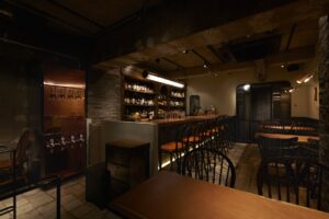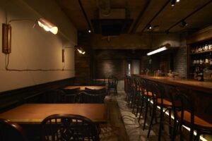 開放感のある店内と世界地図がデザインされたバックバーは 海外のバーに訪れたような、
